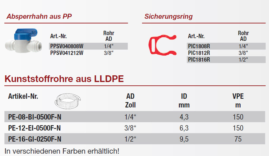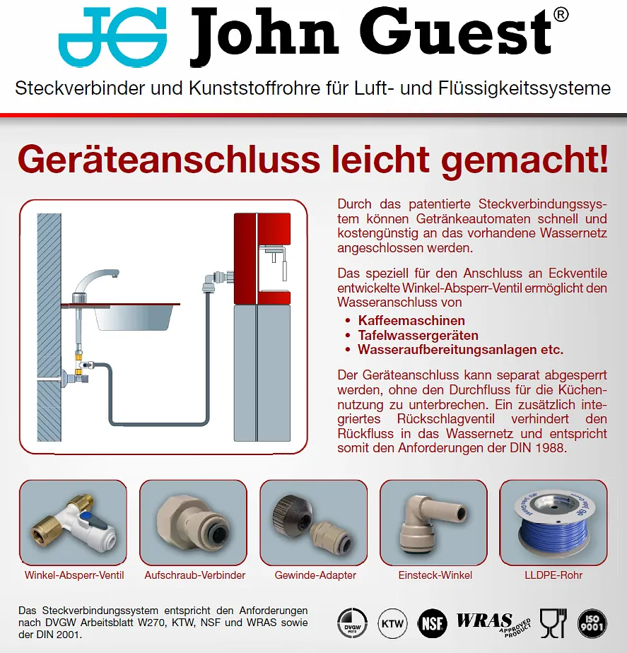 Das renommierte Unternehmen stellt seit Jahrzehnten hochwertige Produkte im Bereich der Automatentechnik her. Im Zentrum steht für John Guest die Qualität und Langlebigkeit, die der Betrieb durch optimierte Qualitätssicherung für jedes einzelne Stück gewährleistet. Stetige Weiterentwicklung sorgt für innovative Produkte mit stets neuen, intelligenten Eigenschaften. JG Systeme sind nach ISO 9001 produziert, für seine hervorragenden Artikel hat das Unternehmen mehrere weltweite Auszeichnungen erhalten. Verwöhnen Sie Ihre Automaten in Österreich und Deutschland mit Ventilen, Steckverbindern, Rohren und Schläuchen des anerkannten Herstellers.